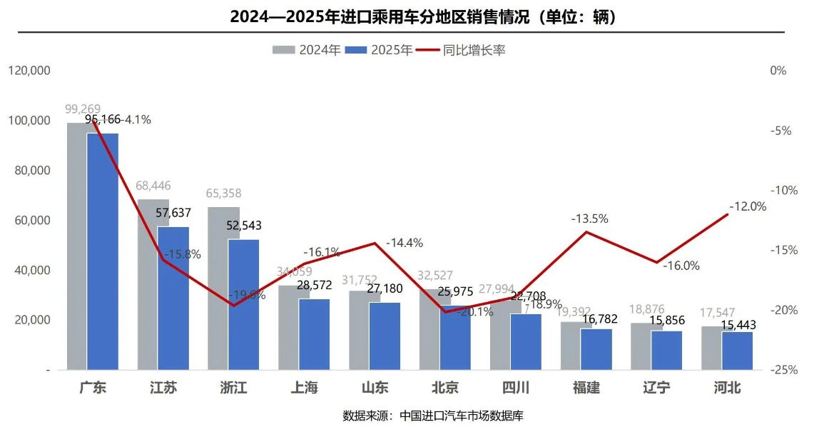 具体来看,2025年11月,进口车前二十品牌中仅有4个品牌销量实现增长,雷克萨斯、奔驰和宝马依然稳居前三名。分区域看,2025年1至11月,进口车销量前十省份均呈现同比下滑。其中,广东、江苏、浙江销量继续位列前三,而北京销量同比降幅最大,达20.1%。