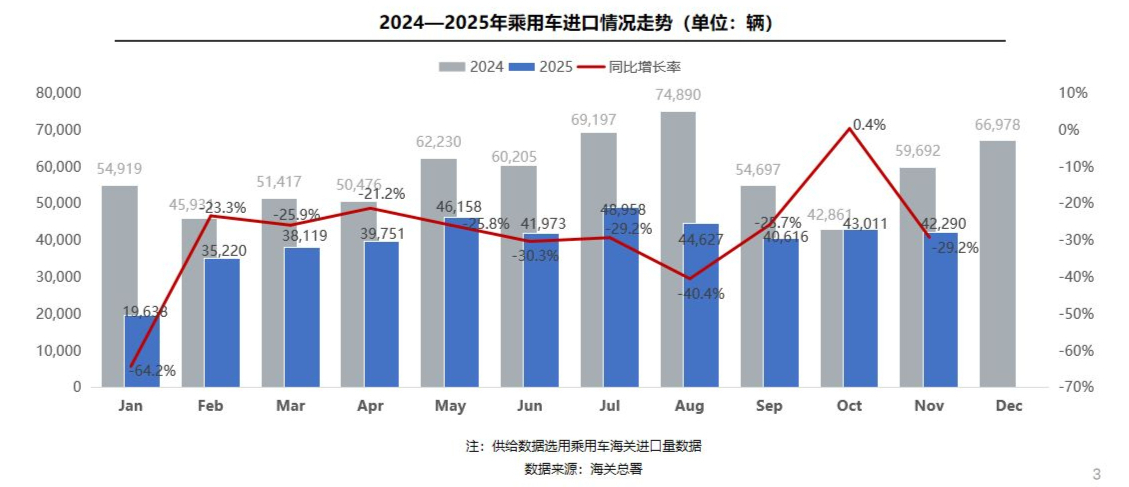 日前,中国汽车流通协会发布的最新中国进口汽车市场月报显示,2025年11月,我国乘用车进口量约4.2万辆(含底盘),同比下滑29.2%,环比下滑1.7%;2025年1至11月,我国乘用车累计进口量约44.0万辆,同比下滑29.7%,进口量已连续四年负增长。
