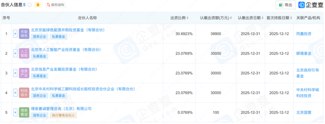 12月15日,据企查查APP,璟泉启智(北京)股权投资基金合伙企业(有限合伙)近日成立,出资额13亿元,经营范围包含:私募股权投资基金管理、创业投资基金管理服务。企查查股权穿透显示,该企业由北京京能绿色能源并购投资基金(有限合伙)、北京市人工智能产业投资基金(有限合伙)、北京信息产业发展投资基金(有限合伙)等共同出资。